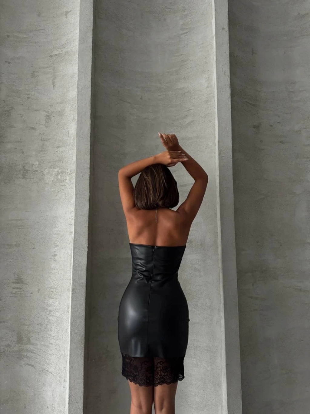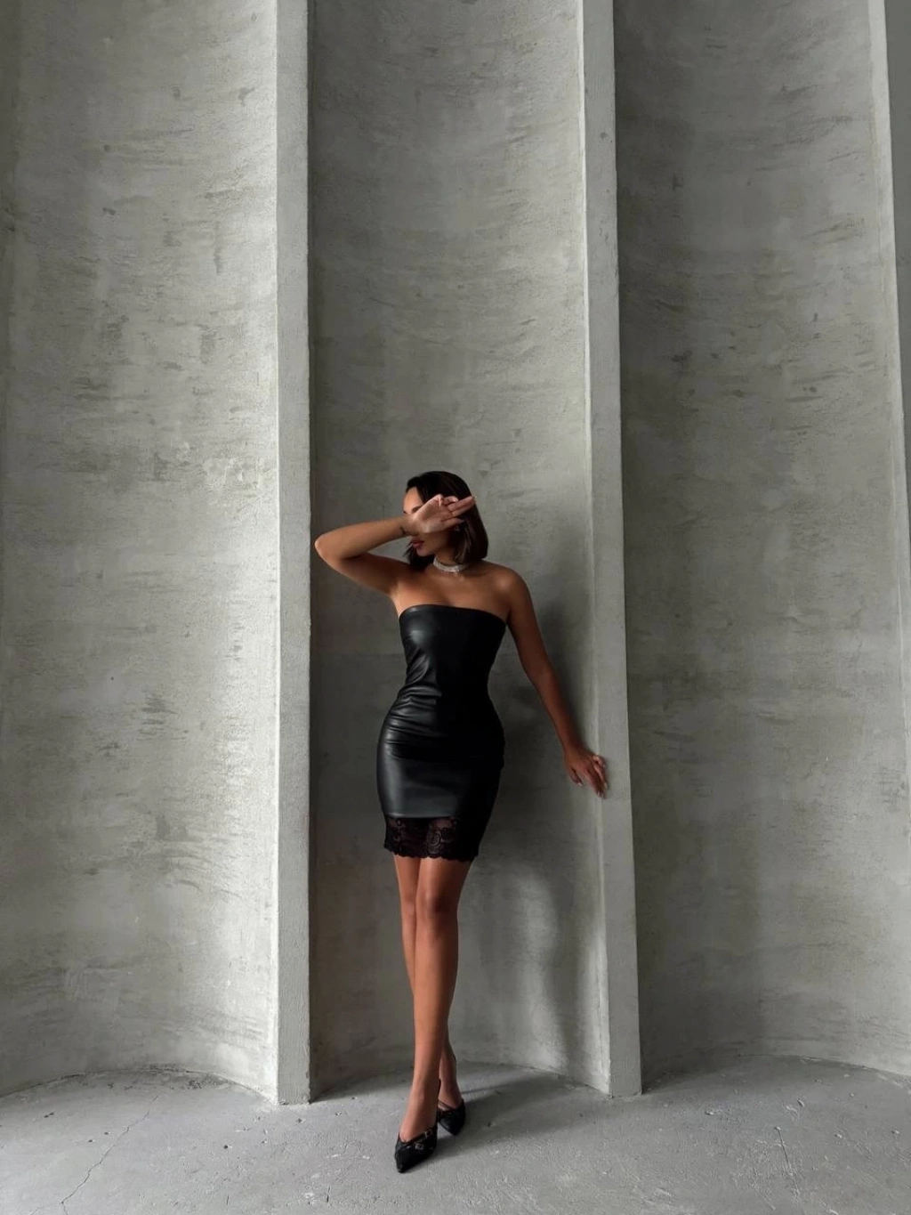 Altı dantelli straplez deri elbise w240419, şıklığı ve tarzı bir arada sunar.