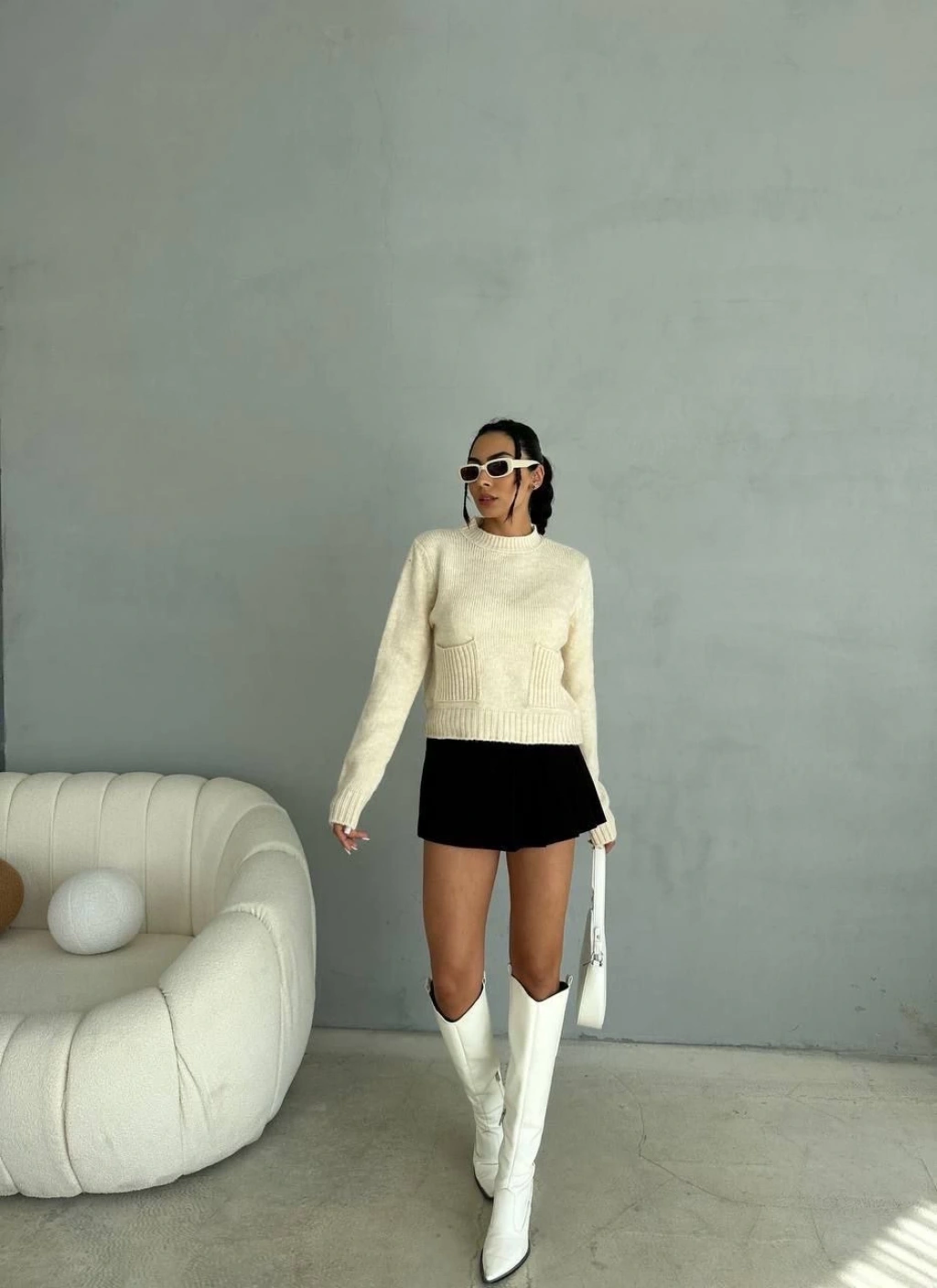 Yumuşak ve şık bir görünüm arayan kadınlar için ideal olan Cepli Triko Kazak Krem, gardırobunuzun vazgeçilmezi olmaya aday!