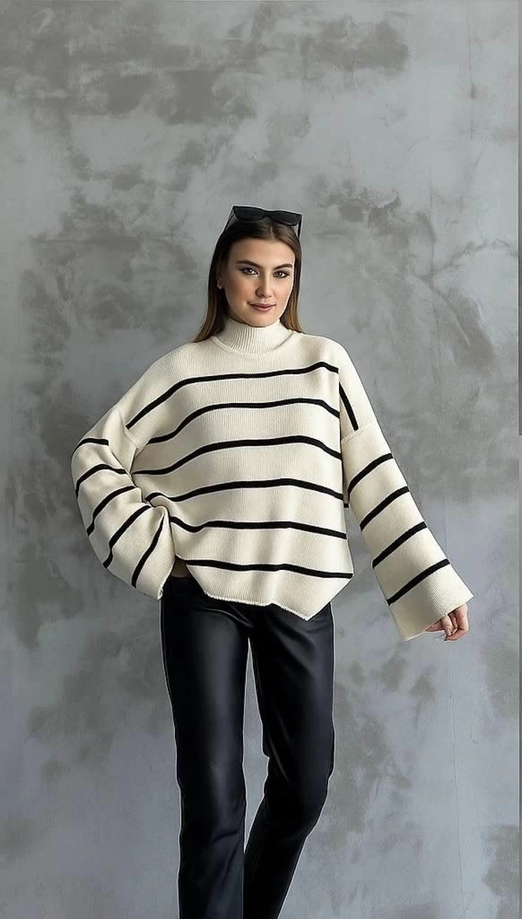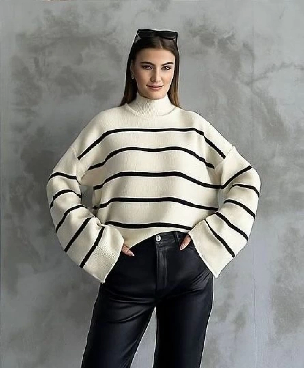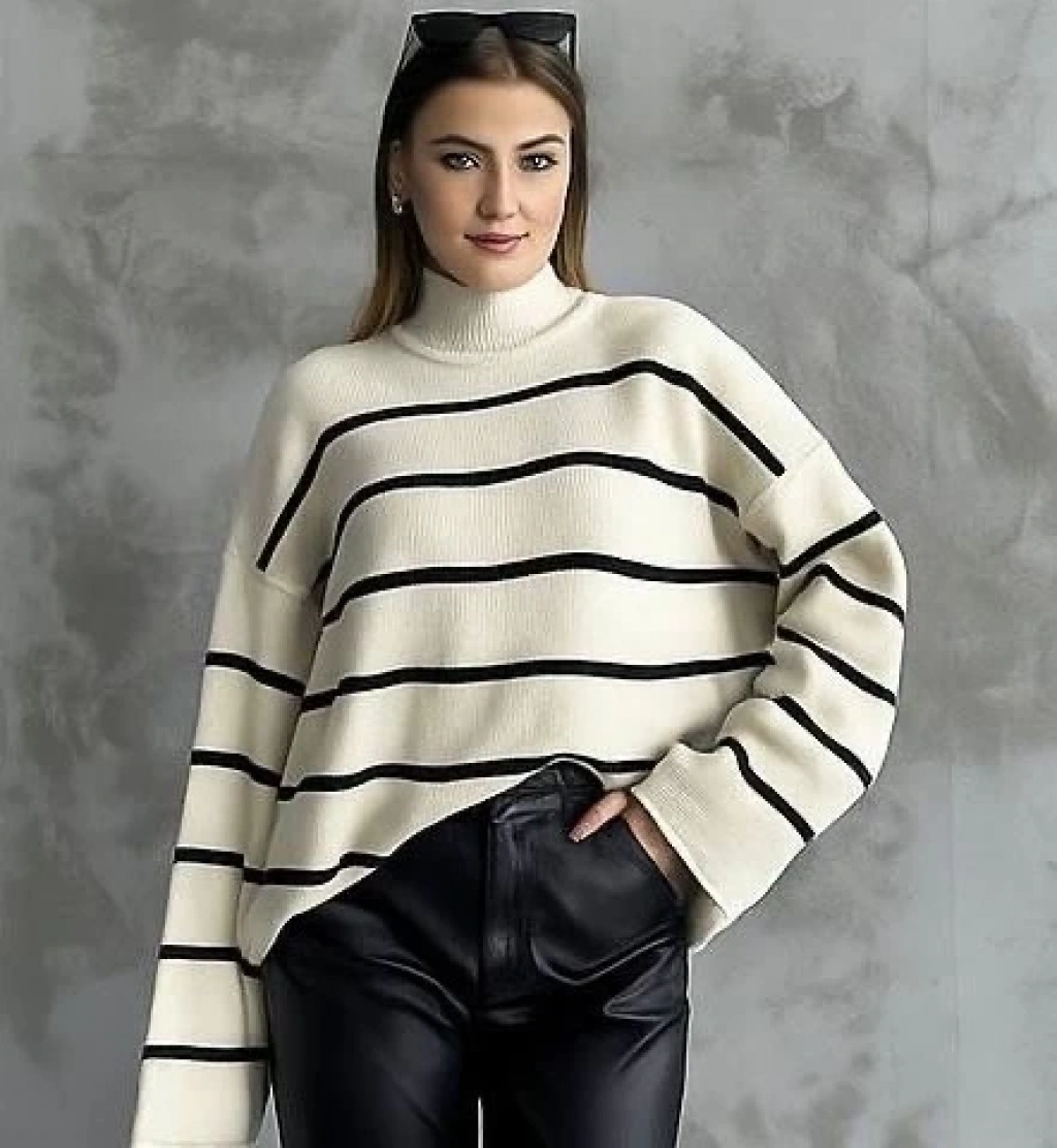 Beyaz rengi ve ispanyol kol detayıyla şıklığı ön plana çıkaran Çizgili İspanyol Kol Triko Boğazlı Kazak, gardırobunuzun vazgeçilmezi olmaya aday! Yumuşak ve kaliteli triko kumaşı sayesinde hem şık hem de rahat bir kullanım sunar.