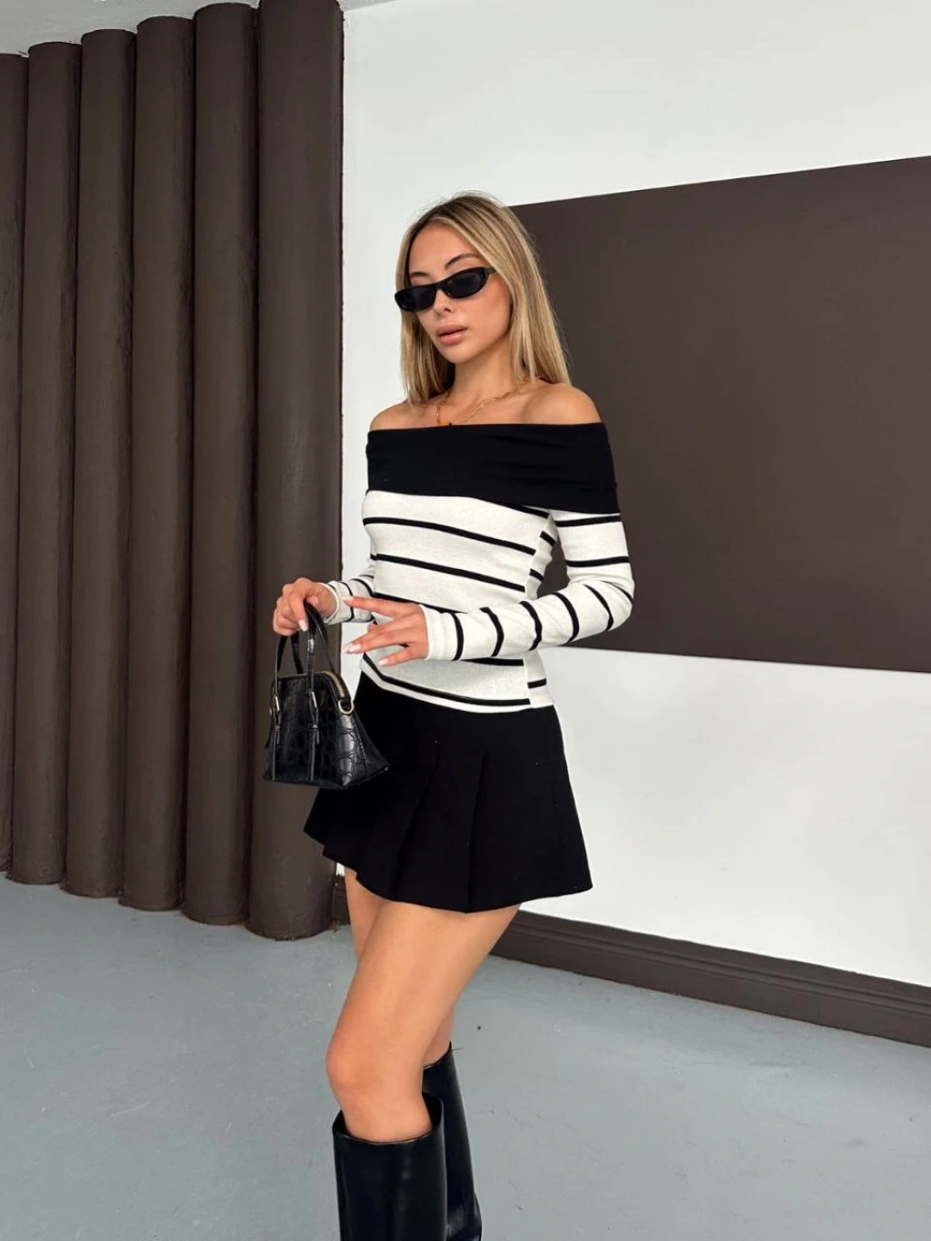 Çizgili madonna yaka kaşkorse bluz siyah a844