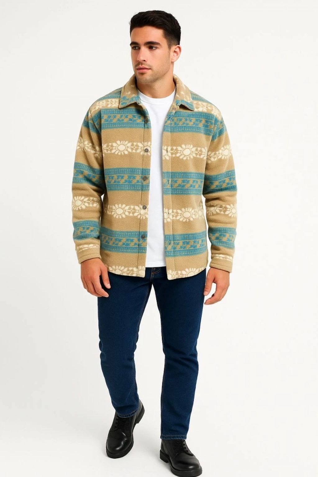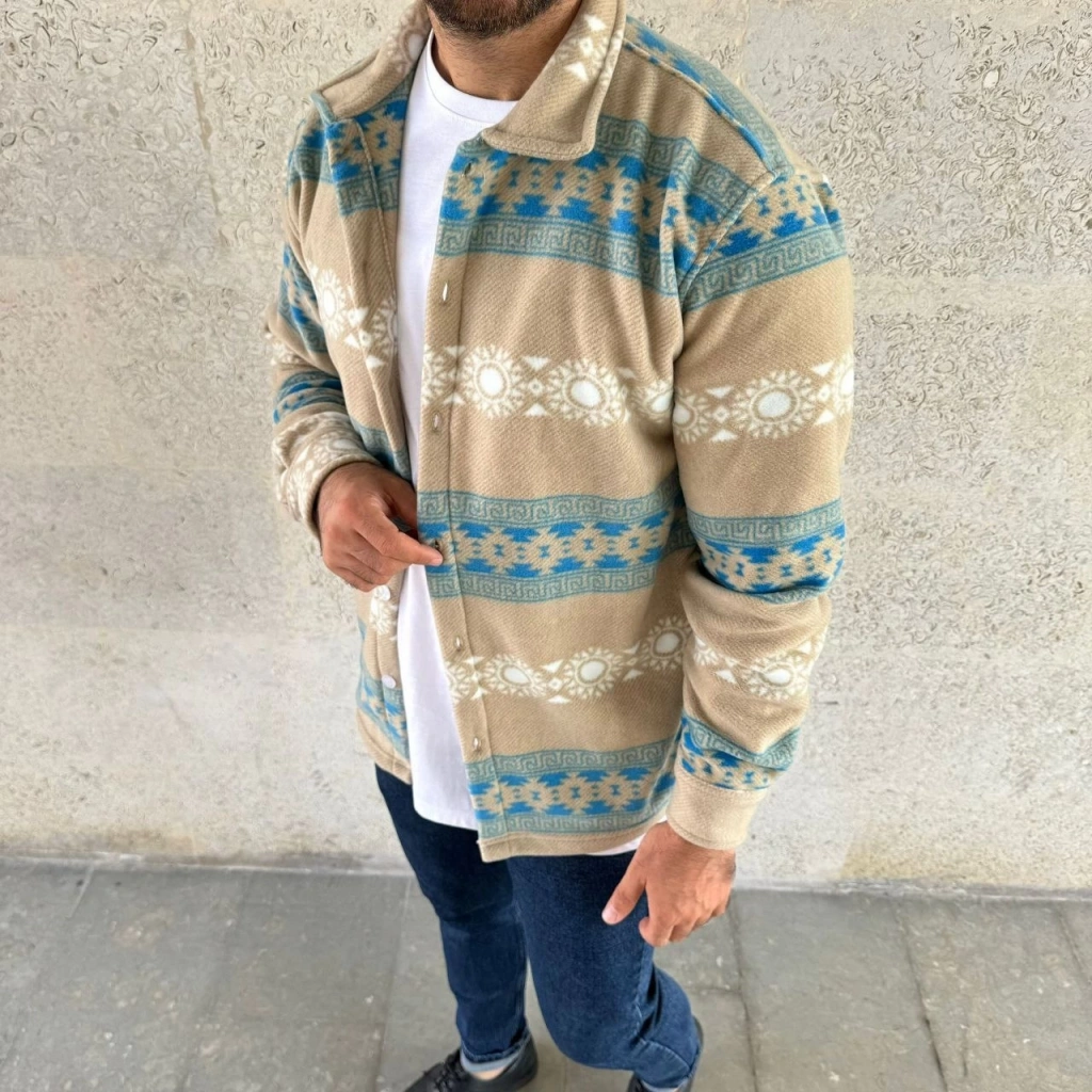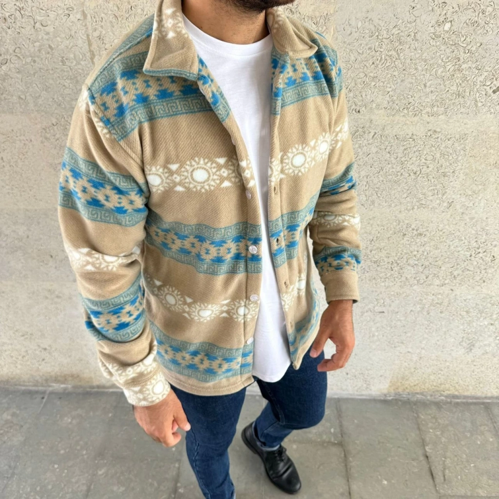 Erkek Desenli Polar Gömlek – Etnik Şerit Desen Yakalı, Uzun Kollu, Düğmeli, Oversize Rahat Kalıp - Sarı