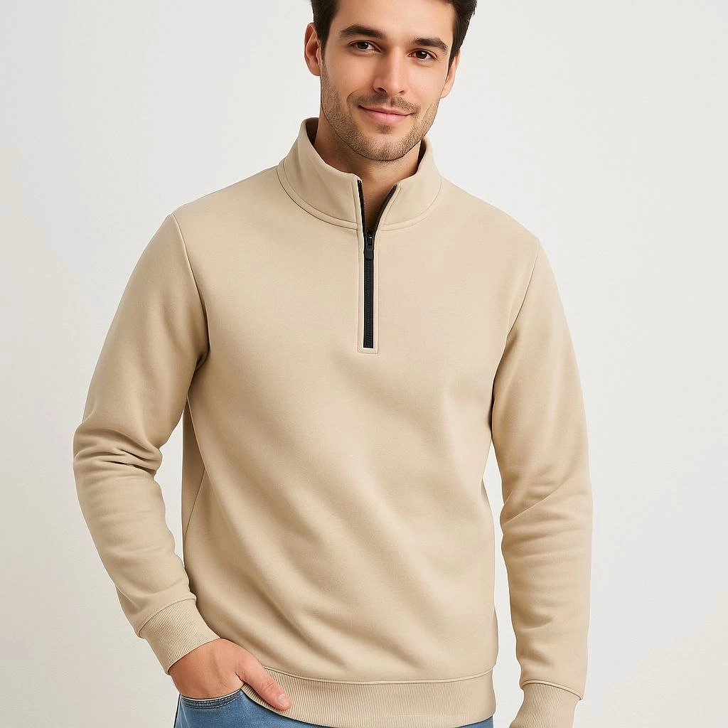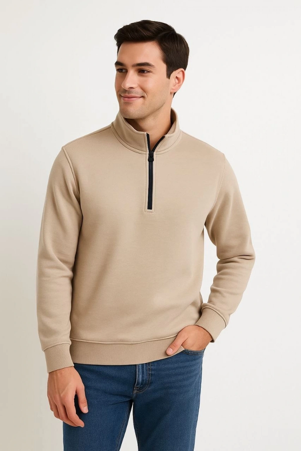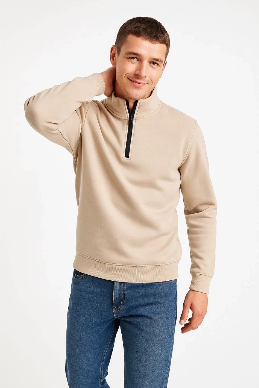 Erkek Dik Yaka Sweatshirt Dik Yaka Yarım Fermuarlı 3 İplik Şardonlu Pamuk Kumaş - Bej