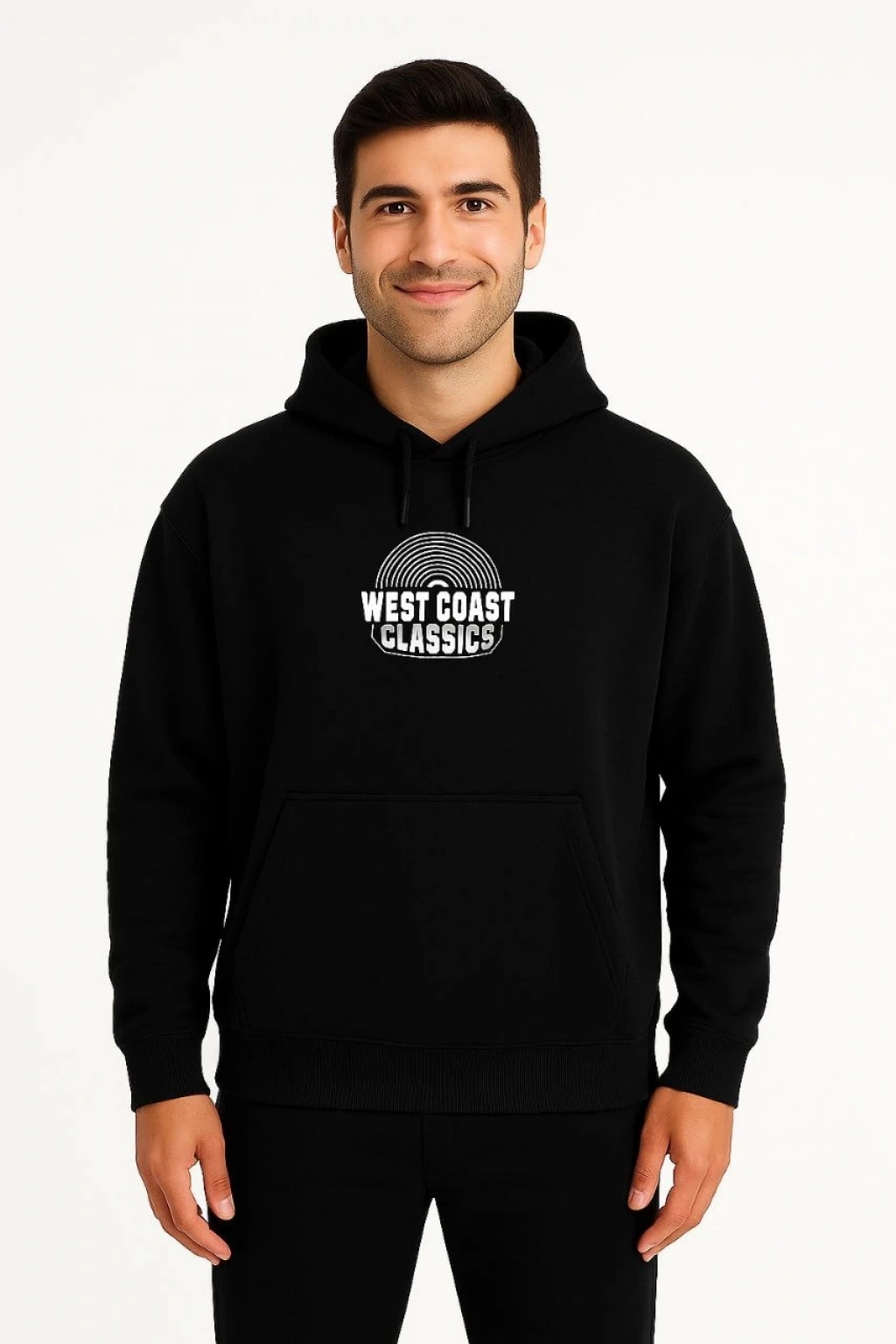 Erkek Kapşonlu Sweatshirt – Oversize Üç İplik Şardonlu Hoodie, “West Coast Classics” Ön & Arka Baskılı, Kanguru Cepli Kışlık Günlük Stil - Siyah