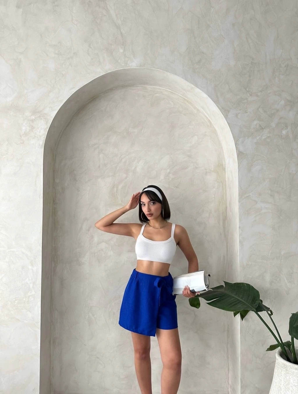 Fiyonklu Şort Etek Saks S255021 ile hem günlük hayatta hem de özel günlerde tarzınızı yansıtabilirsiniz. Şıklık ve konfor arayan kadınların favorisi olmaya aday!