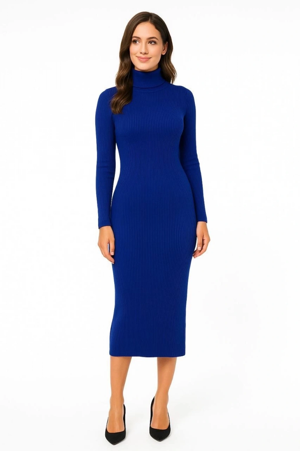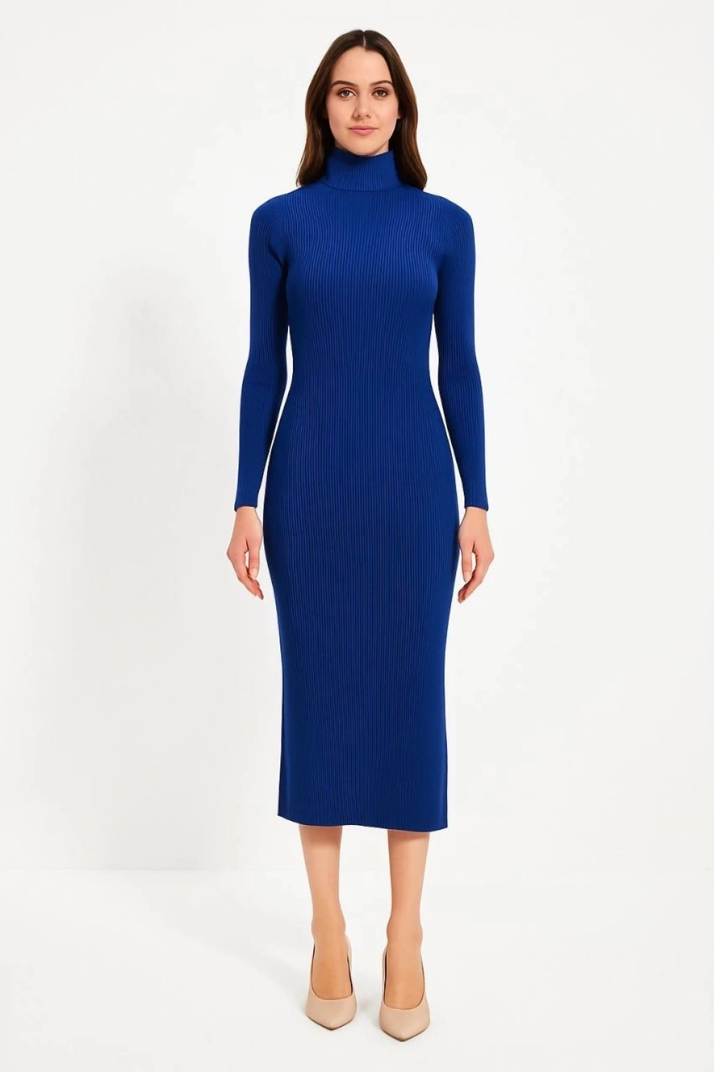 Kadın Boğazlı Triko Elbise – Uzun Fitilli Esnek Dokuma, Tam Kalıp, Kışlık & Baharlık Şık Rahat Stil, 130 cm Midi Boy Elbise - Saks Mavisi