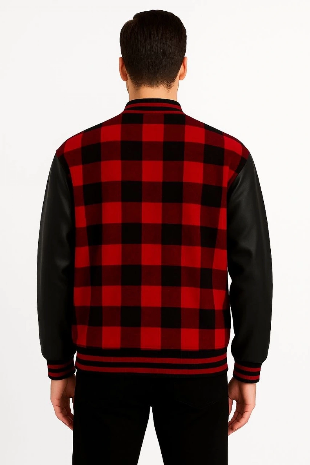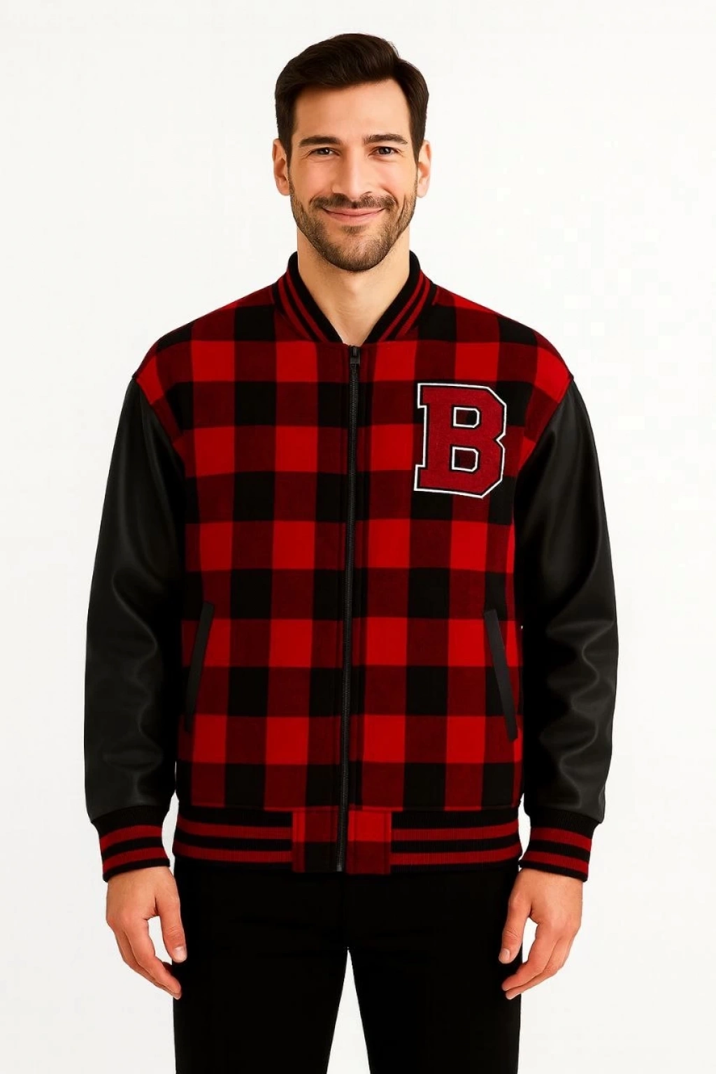 Erkek Kolej Ceket – Kareli Oduncu Kumaş, Kolları Suni Deri, Fermuarlı, İçi Kapitone Astarlı, Nakışlı Oversize Bahar & Kış Stil - Bordo
