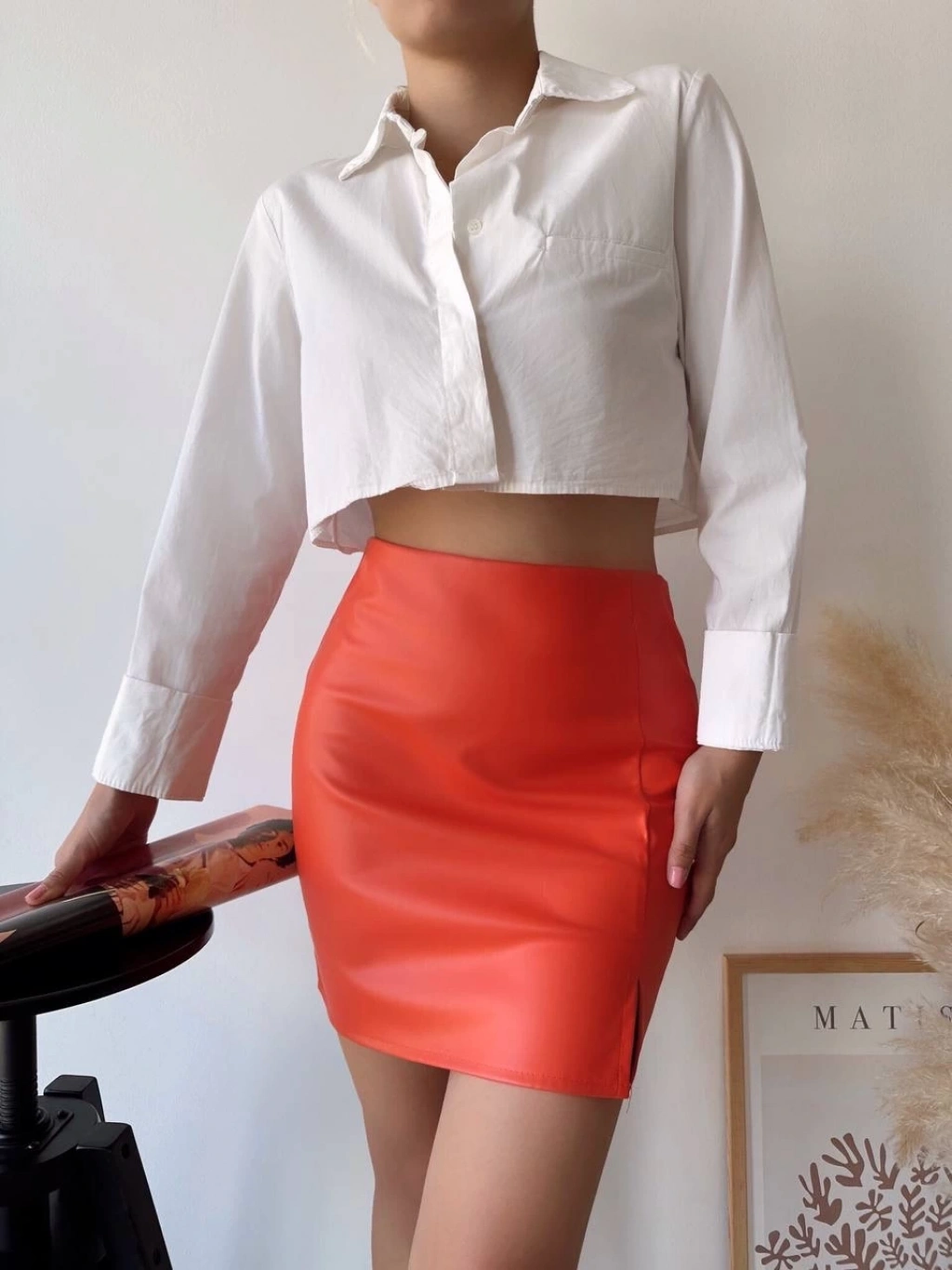 Yeni sezonun trend parçalarından olan turuncu deri etek, gardırobunuza enerjik bir dokunuş yapacak!