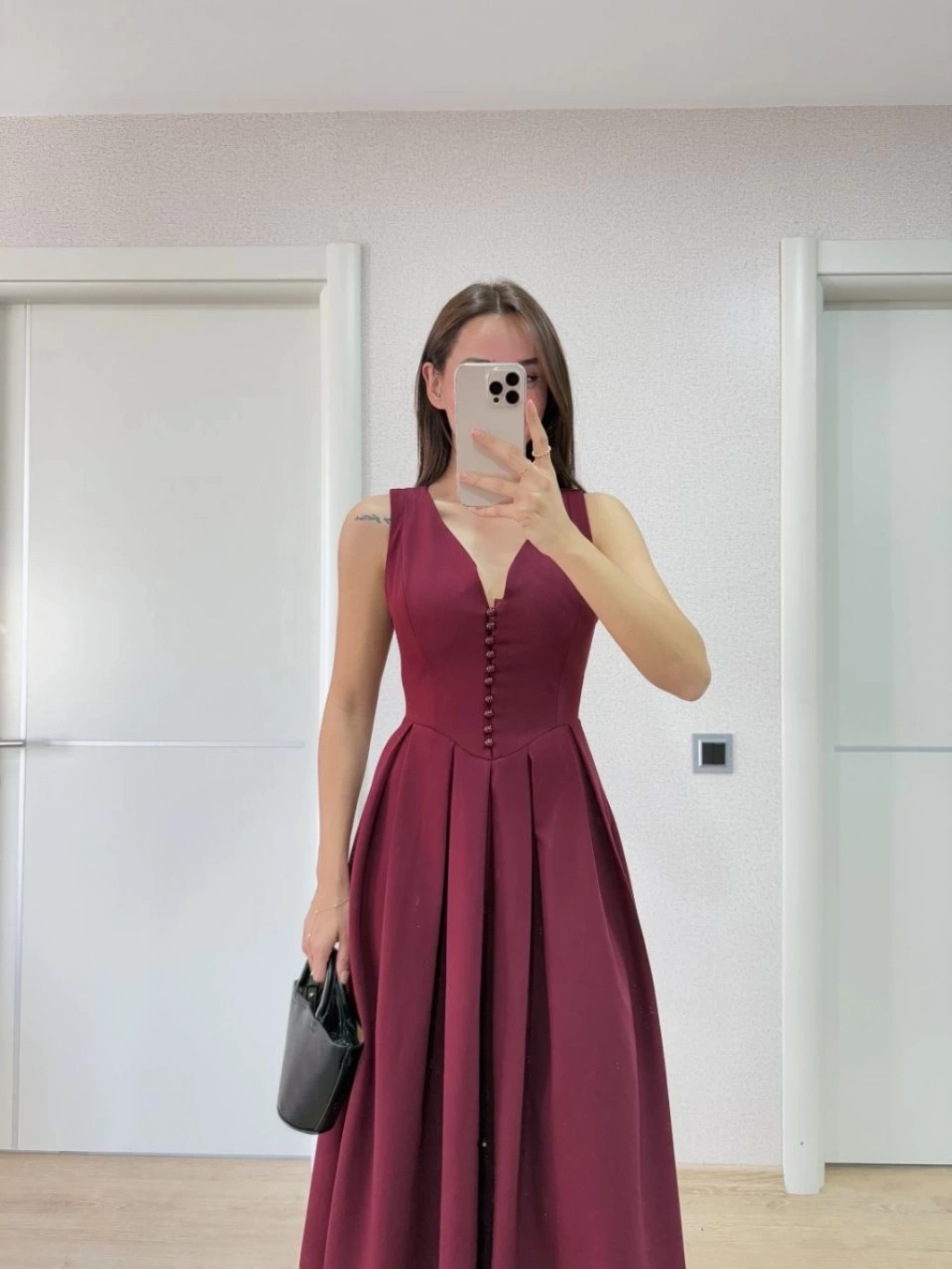Detay | Arkadan ve önden Pens Detaylı , Göğüste ince boncuk Detaylı , Kolsuz , Uzun Elbise , V Yaka , Yandan Fermuarlı |