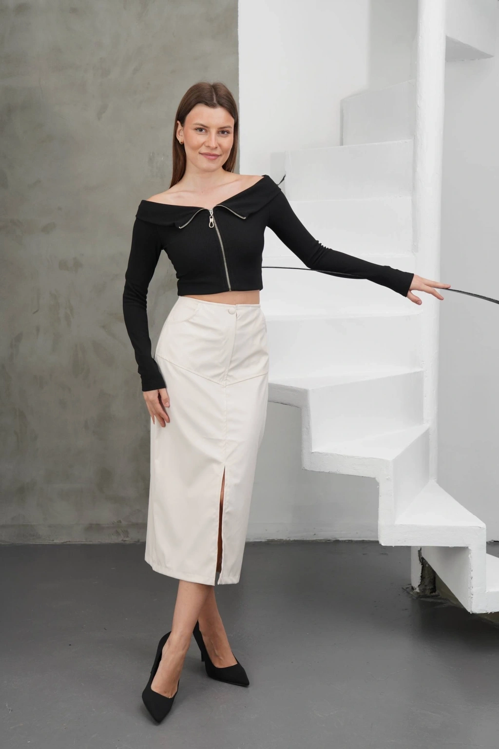 Yırtmaçlı uzun deri etek krem rengiyle gardırobunuza şıklık katacak bir parçadır.